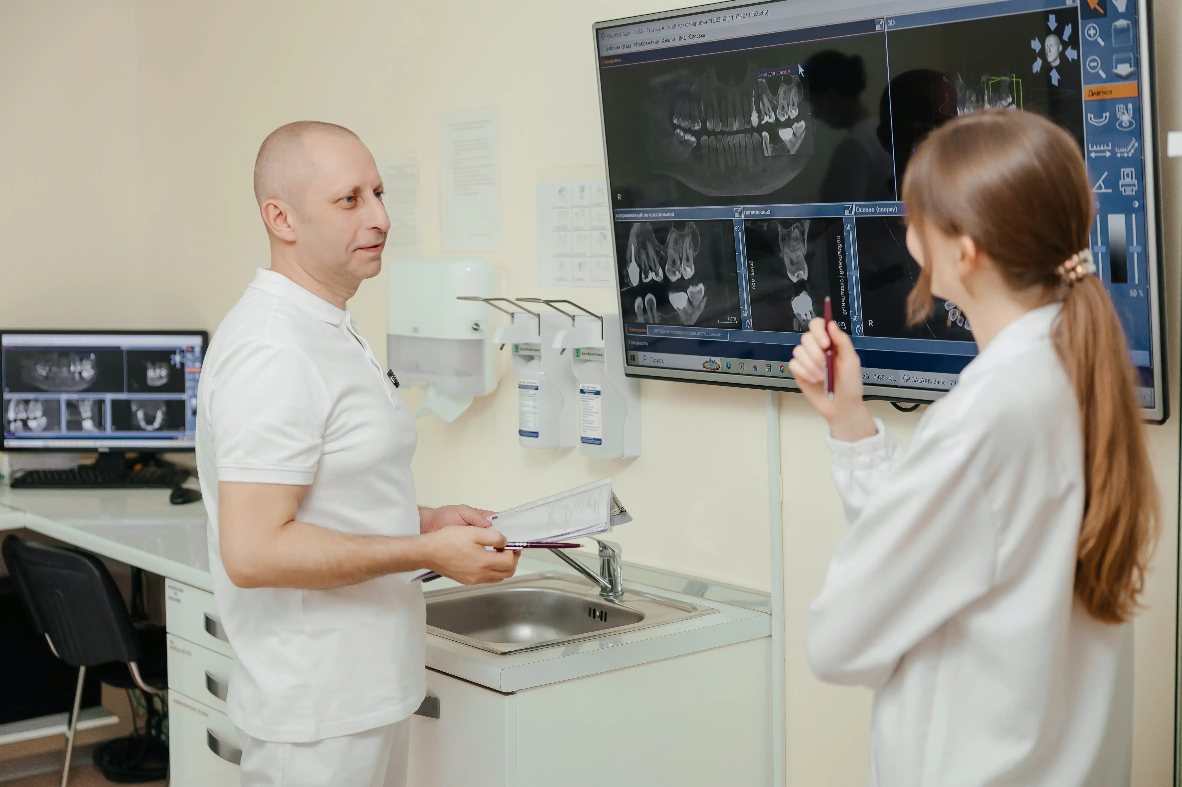 Врач проводит осмотр, оценивает состояние зубов, выбирает тип ретейнера и назначает чистку. -
